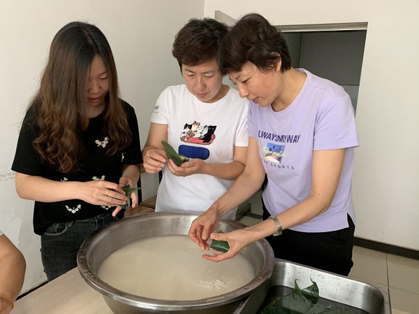 上午9点,粽叶、糯米、大枣整齐地摆上桌。大家边包边聊,其乐融融。包粽子现场,熟悉包粽子的能手们飞快地拿起粽叶,两手一窝卷成漏斗状,填米、加枣、压紧、扎绳,一气呵成。她们还充当起“老师”的角色,教“新手”职工包粽子,手把手现场教学,老师”教得仔细,“学生”学得认真,但要做出馅料十足、外观漂亮的粽子还是需要费一番功夫的。随着技巧的不断娴熟,一个多小时的时间,形状各异、大小不一的一百多个粽子就堆积成山了,预算科副科长窦梦娜说:“我们包粽子的水平真是越来越高了,明年再包会更好!”此时每个人心里都洋溢着一股喜悦之情,有初学一门手艺的欣喜,有参与集体活动交流感情的满足。