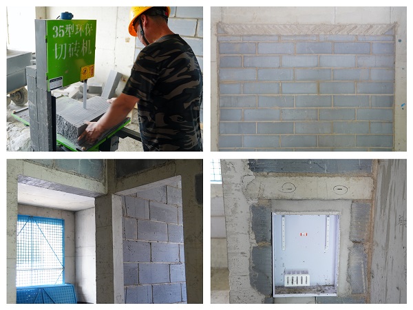 在材料利用与成本控制方面,项目团队探索出了“更优解”。针对顶部斜砌施工,项目部原计划采购混凝土预制块进行砌筑,但在论证中发现采购的预制块存在成本高、运输损耗大、工序衔接慢等弊端。经过反复研讨,项目团队决定就地取材,利用现场加气混凝土砌块施工剩余的裁切废料,通过定型化切割模具进行精准切割,替代外购预制块。为保障方案顺利实施,项目部提前抽调技术娴熟的切割工,组织加气块切割专项培训,同时提前安装调试好40余台高精度切割设备,现场切割作业得以高效展开。这一创新方法的运用,将加气块材料的现场利用率提高到90%以上,其切割面更加平整,有效保障了斜砌质量和结构整体性,提升了观感效果。
