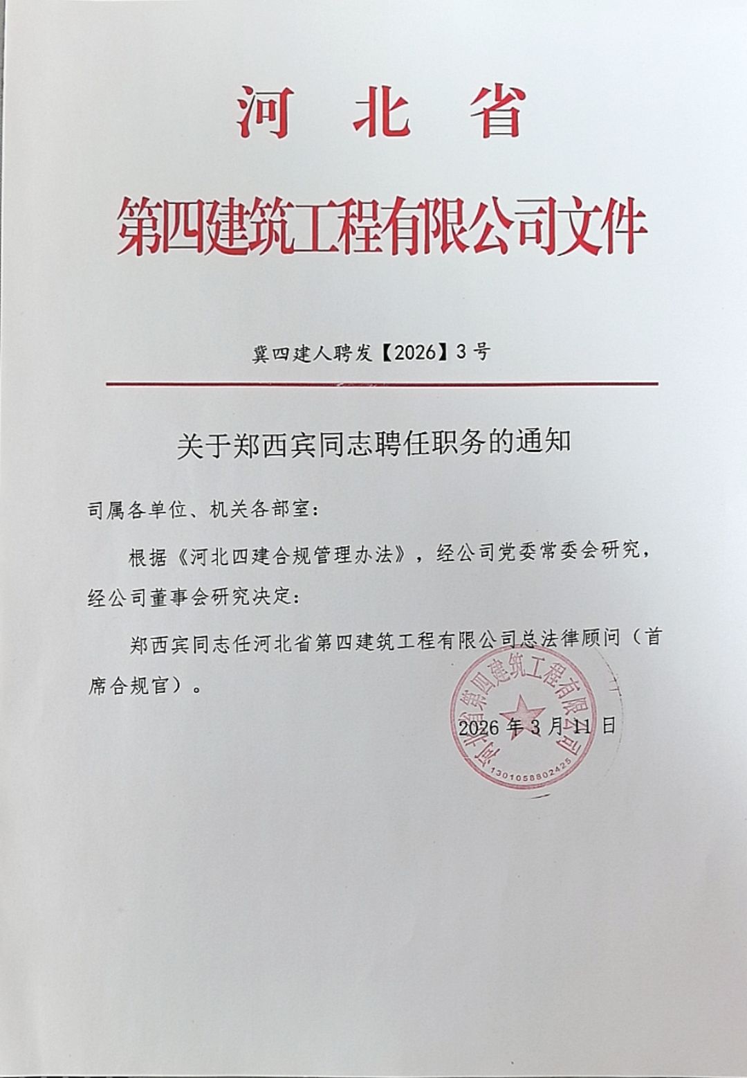 关于郑西宾同志聘任职务的通知